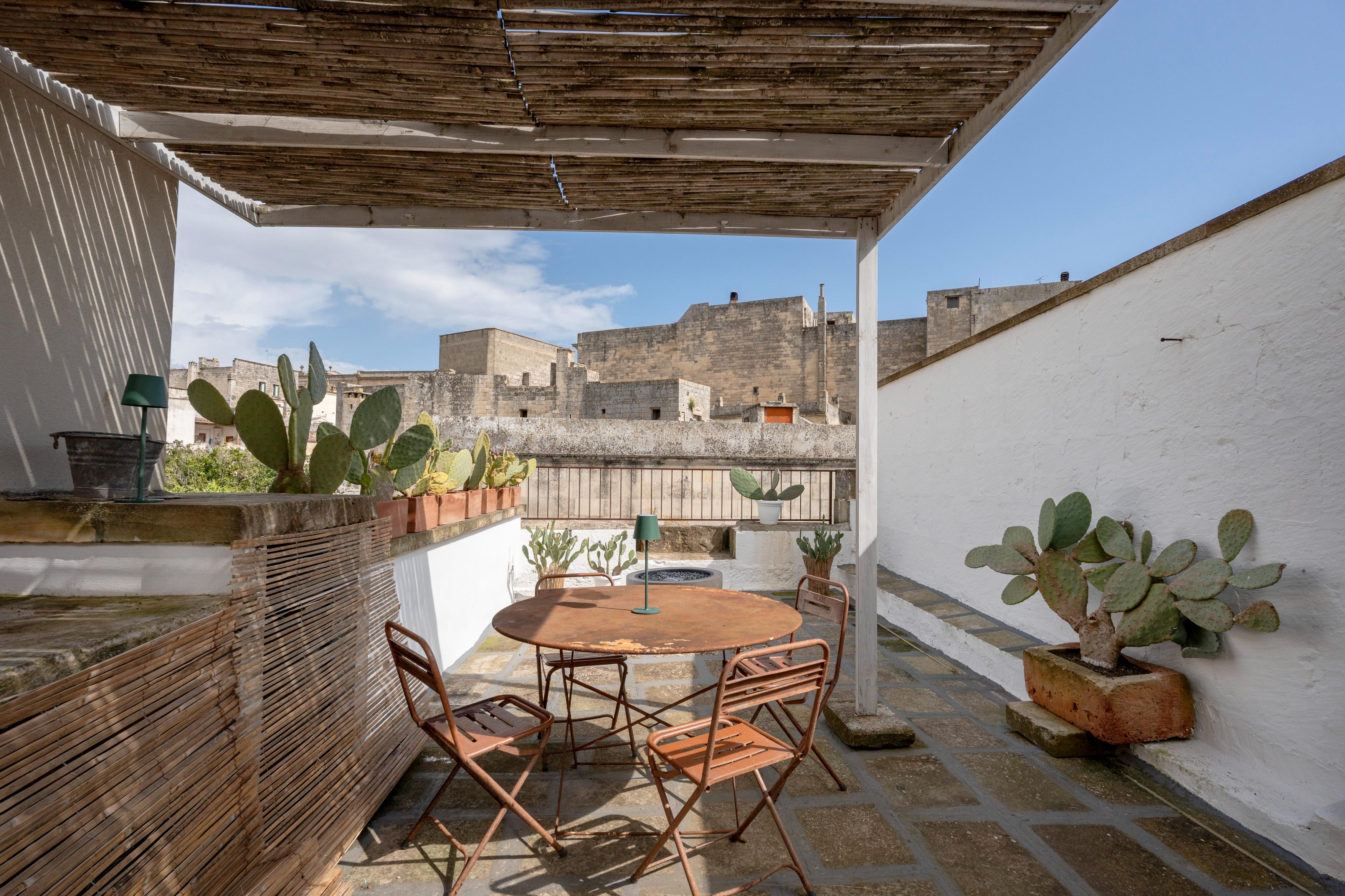 Achter een eenvoudige deur in het hart van Scorrano begint een ander ritme. Camare 44 is een intieme, door een kunstenaar ontworpen studio in het historische centrum, waar steen en licht samen een rustige en verfijnde sfeer creëren. Een plek waar je vertraagt en de buitenwereld even loslaat. Op het privéterras opent alles zich — met zicht over het oude dorp, rustige ochtenden en warme avonden onder de pergola. Perfect gelegen tussen beide kusten bereik je moeiteloos Otranto, Gallipoli en Lecce. Buiten ervaar je het echte Salento, binnen vind je je eigen plek van rust. De studio van 40–44 m² is open en vloeiend ingericht, met wonen en slapen in één geheel, geschikt voor maximaal 3 gasten. De karakteristieke gewelfde plafonds en natuurlijke materialen geven de ruimte haar warme en authentieke uitstraling. Het terras vormt een verlengde van de woning — een plek waar de dag rustig begint en vanzelf overgaat in de avond. De woning is volledig privé, met exclusieve toegang tot de studio en het dakterras, en gratis parkeren recht tegenover de woning. Gelegen in het historische centrum van Scorrano, naast het wijnhuis Duca Carlo Guarini en bekend om het jaarlijkse lichtfestival in juli, is dit de ideale plek voor koppels of kleine groepen die op zoek zijn naar rust en authenticiteit.